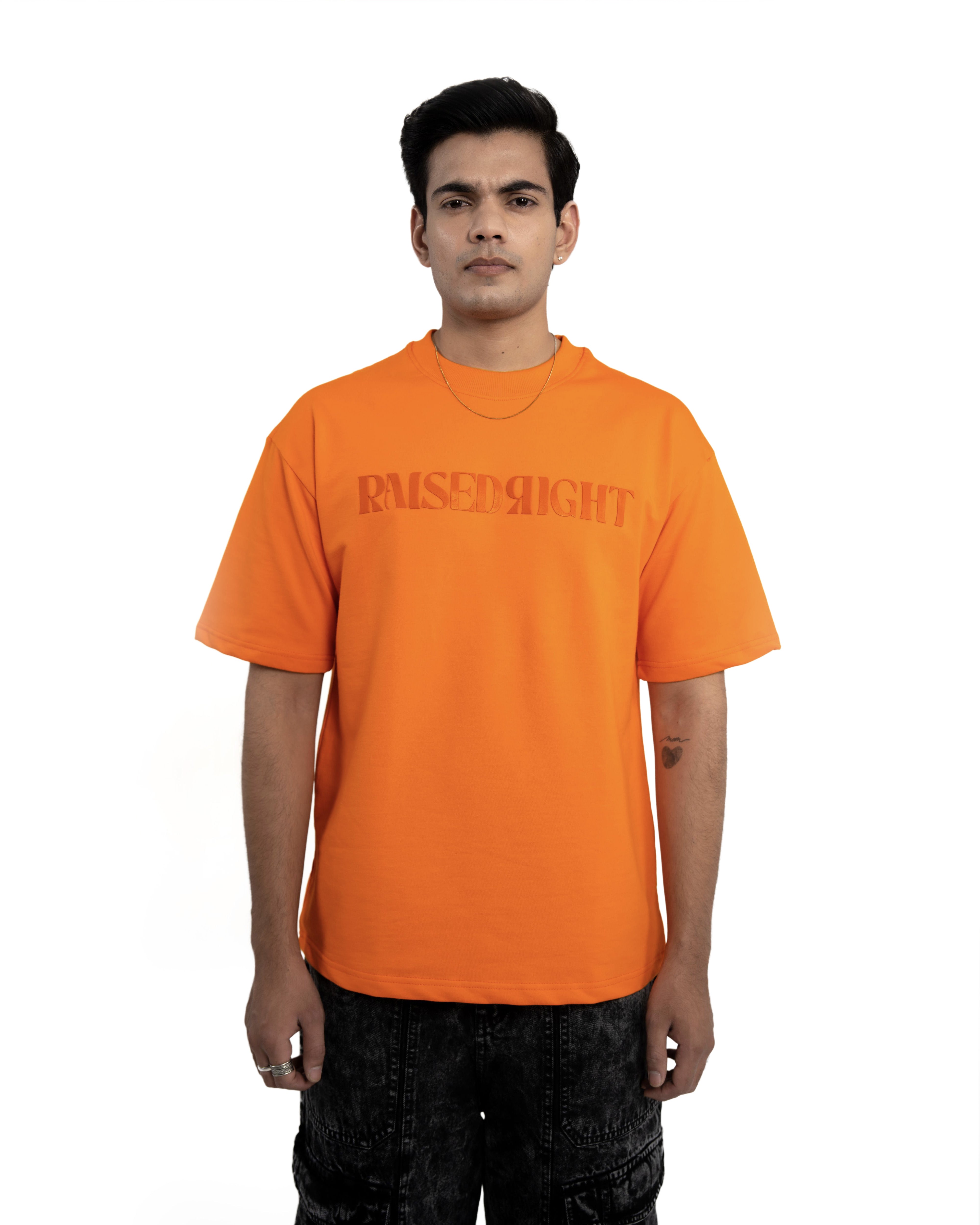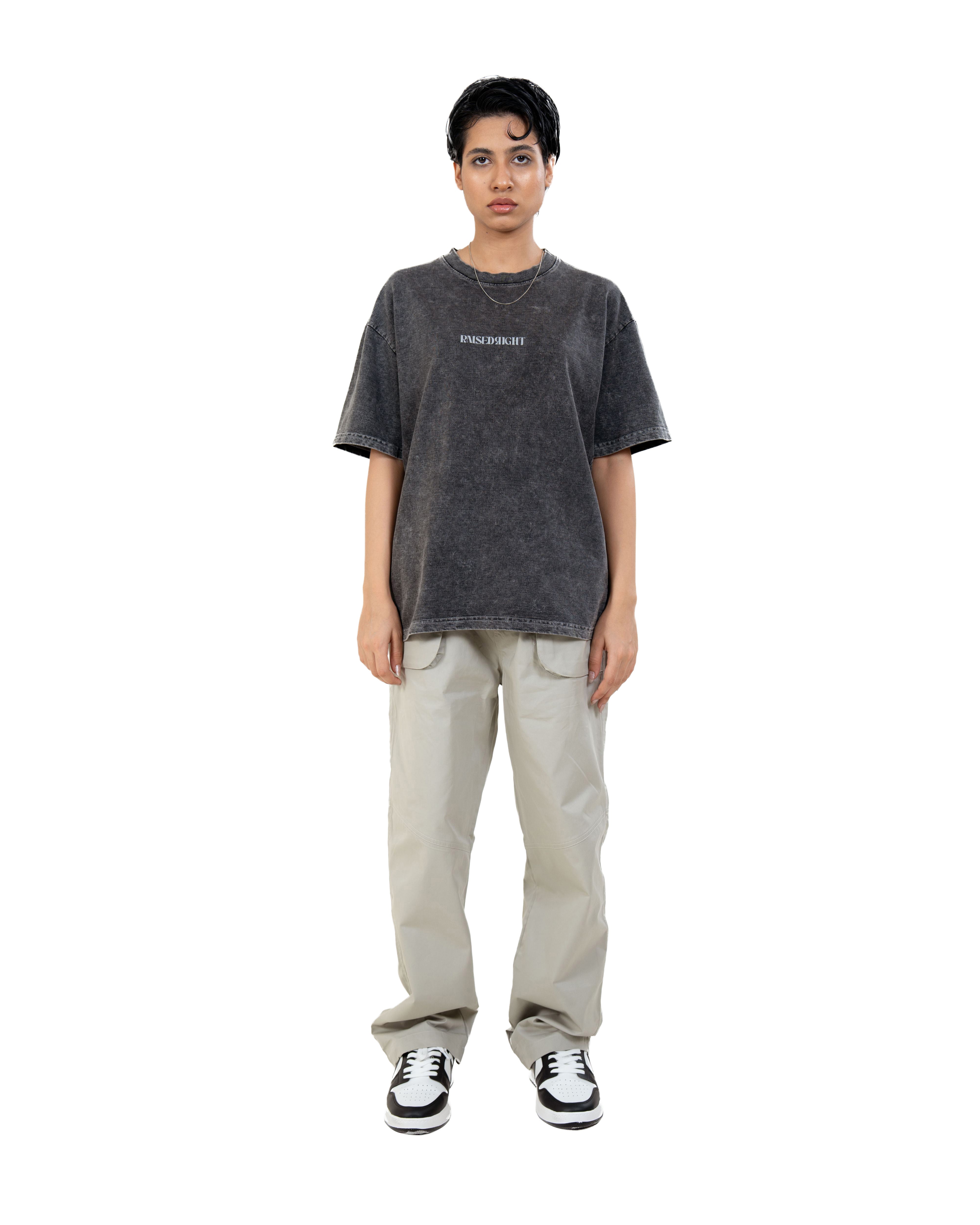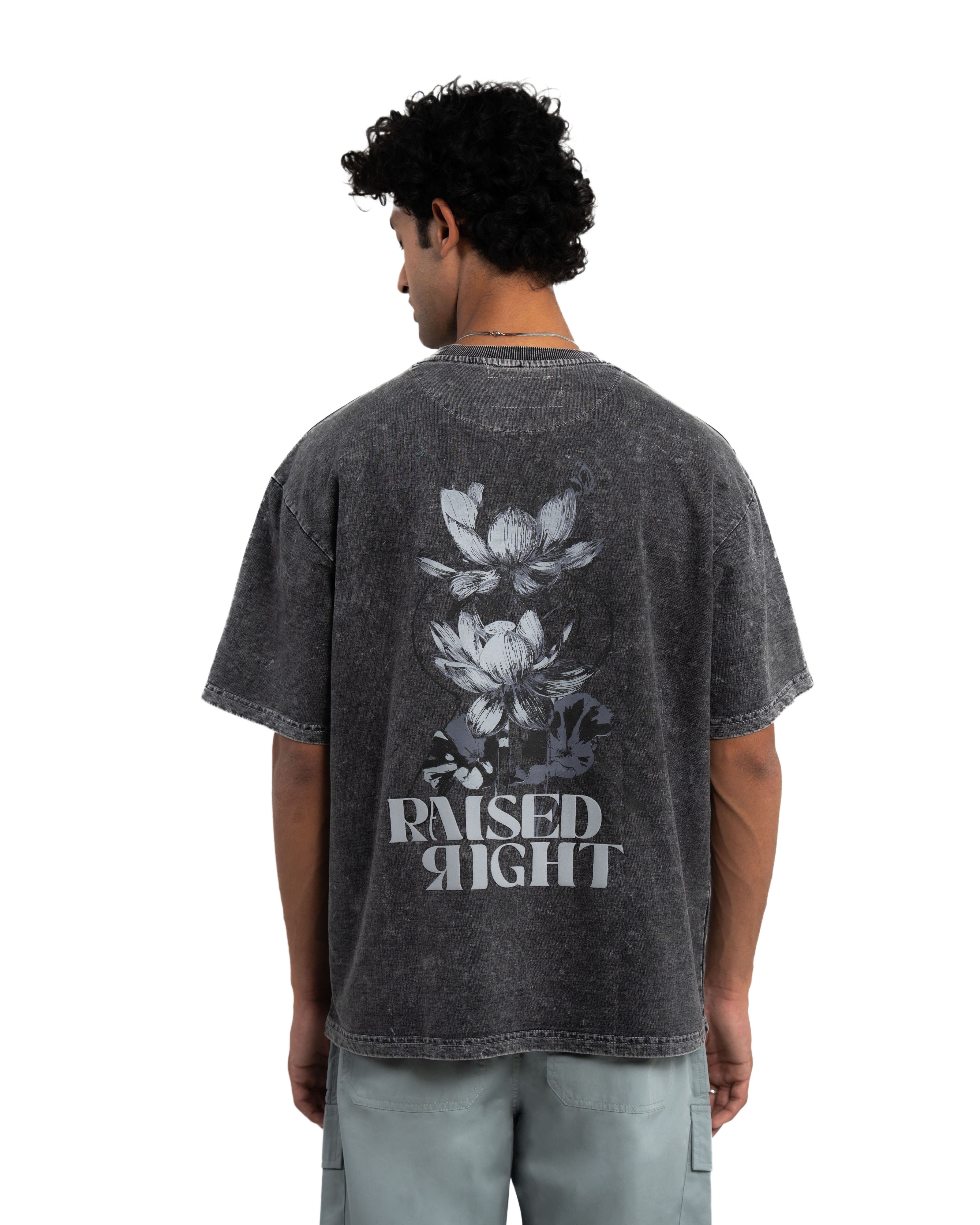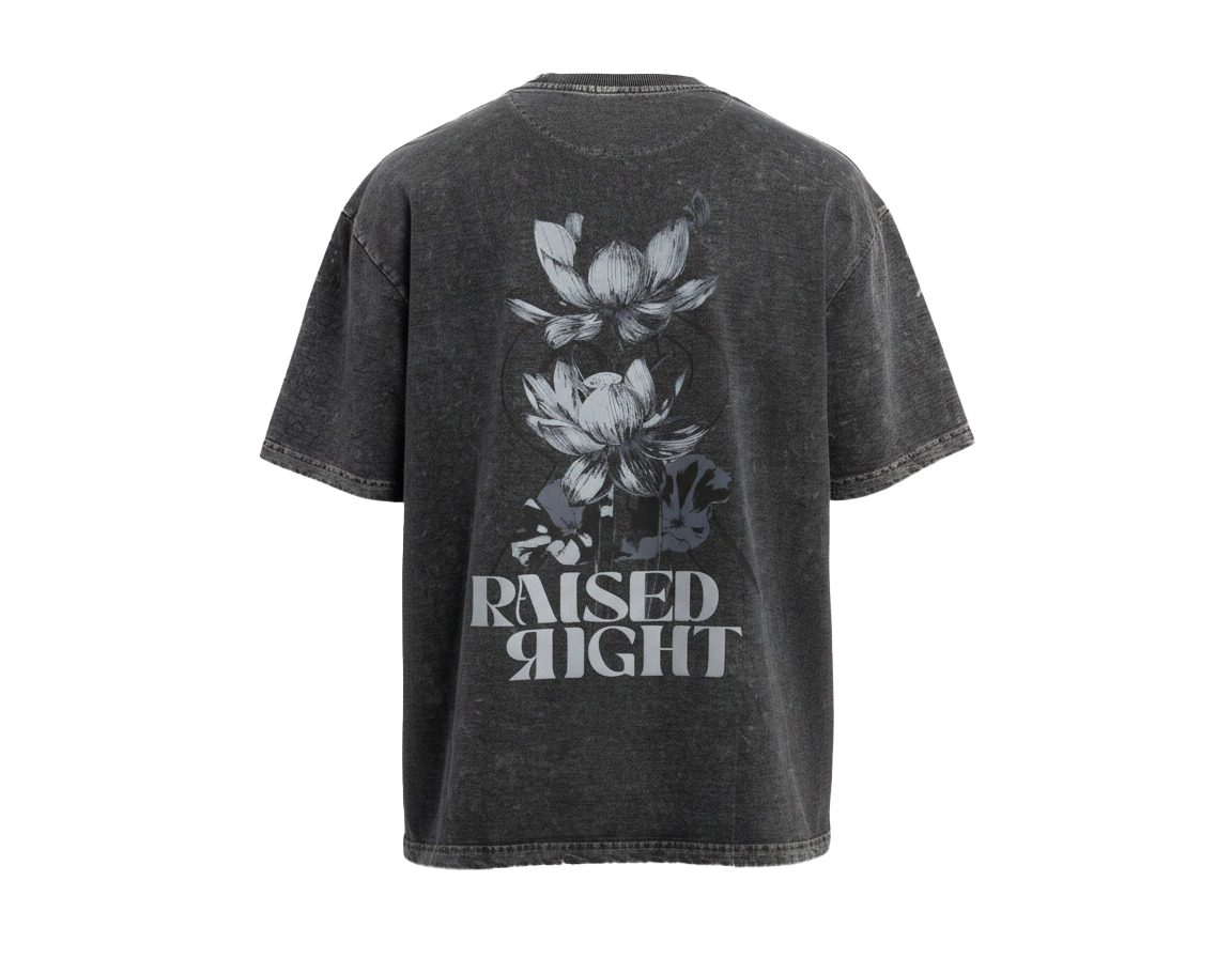 This statement piece features a striking, monochromatic lotus flower design on the back, encapsulating a blend of urban edge and serene beauty. This t-shirt embodies that very message—strength, integrity, and unwavering conviction. The bold "RAISED RIGHT" text adds a touch of rebellion and individuality.