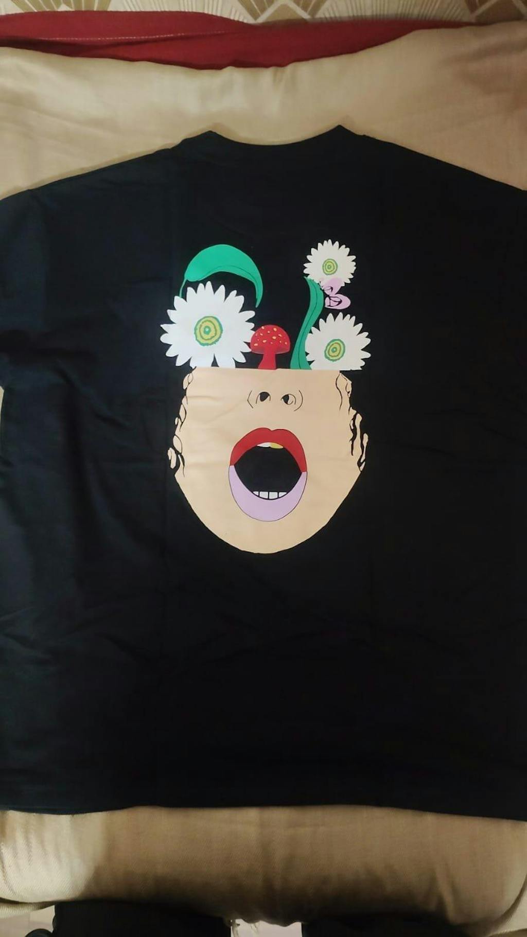 Front - On the front, a bright red mushroom with yellow spots is embroidered on the right chest, adding a whimsical yet grounded element to the design. The contrast between the natural motifs and the minimalist front creates a balance that feels both edgy and soft.