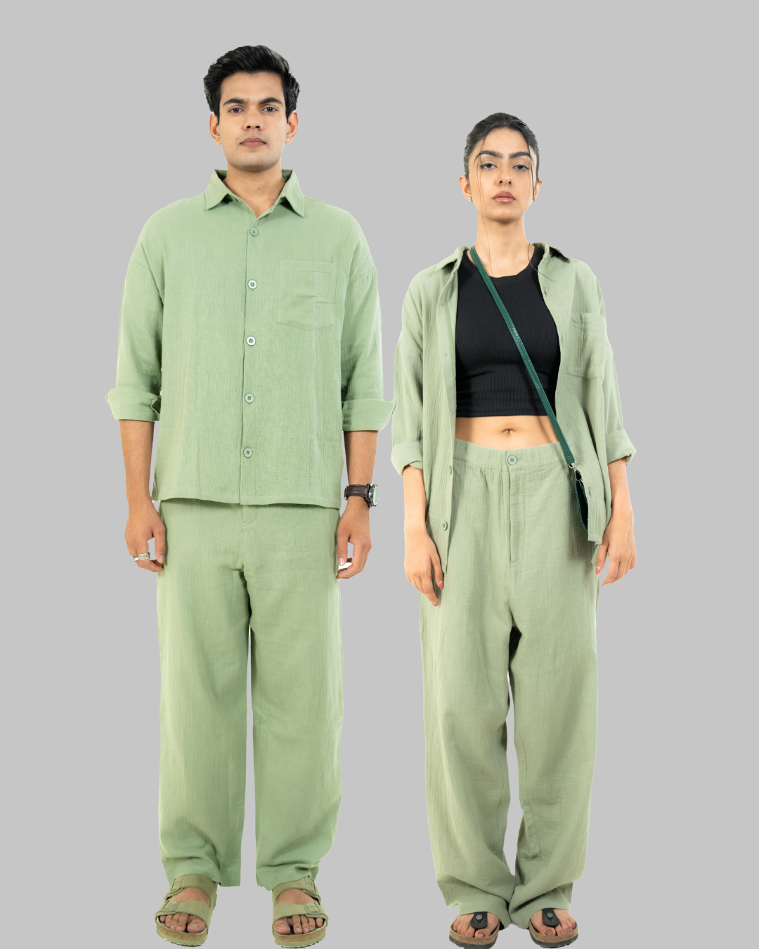 Made with 100% soft cotton, this unisex co-ord set is all about comfort and ease. It includes a relaxed-fit button-down shirt with a chest pocket, paired with breezy, straight-fit pants. The sage green color gives it a clean, effortless vibe—perfect for everyday wear.